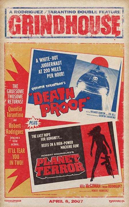 Grindhouse är dubbelfilmen av Tarantino och Rodriguez som släpptes som två separata filmer här på bio i Sverige; Death Proof och Planet terror. Med Grindhouse ville de två regissörerna återskapa känslan och den sunkiga kvalitén från filmerna som gick på Grindhouse-biograferna i USA på 70-talet. Grindhouse-filmer var oftast independent-filmer med låg budget som innehöll mycket våld, naket, blod och politisk inkorrekt humor. Biograferna låg ofta i delarna av staden med lite mindre attraktivt bostadsvärde och det var inte helt ovanligt att uteliggare kom in och sov när filmerna spelades upp. Med Death Proof och Planet Terror har de verkligen lyckats återskapa den risiga bildkvaliteten med flimmer, gulaktiga färger och hack och samma känsla för stilen har även getts för filmaffischerna.
