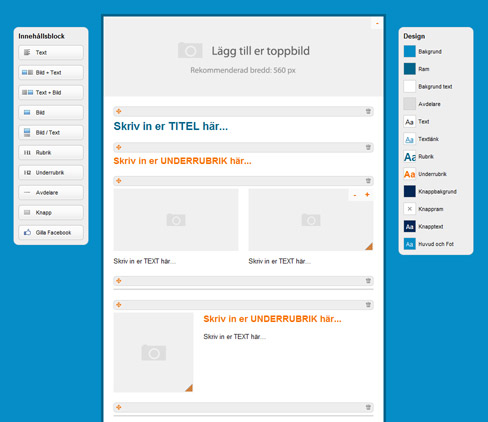 Den stora styrkan jag tror MailerLite har är när du skapar själva nyhetsbrevet. Du behöver inte sitta och knacka HTML-kod och mecka med CSS, utan här drar du helt enkelt i boxar och fält och nyhetsbrevet byggs upp i realtid framför dina ögon. Det hela påminner mig mycket om WYSIWYG-verktyget Squarespace som låter dig bygga bloggar eller hemsidor på ett liknande vis.